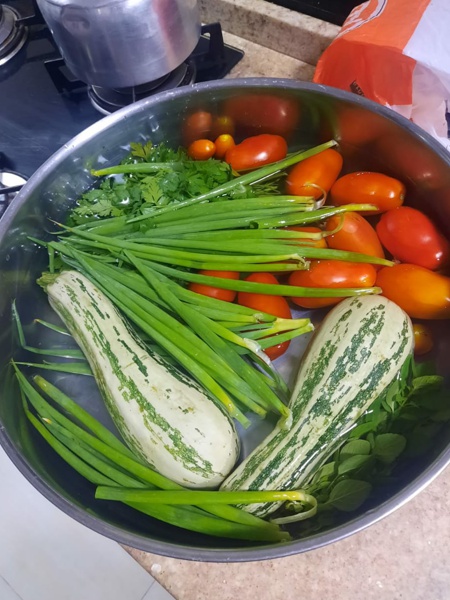 Legumes (batata, cenoura, chuchu, cebola, tomate, abobrinha, abóbora, couve-flor, brócolis), macarrão, azeite, sal, açúcar, chá, pão, temperos verdes, entre outros.